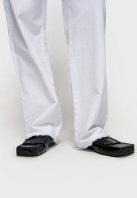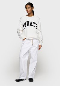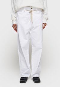 Białe bawełniane spodnie o luźnym kroju, z elastycznym pasem na sznurek, przednimi kieszeniami i postrzępionym dołem. Noszone z czarnymi butami z podszewką.