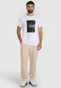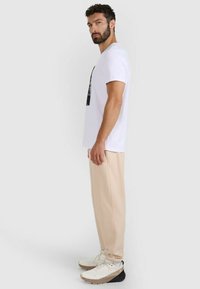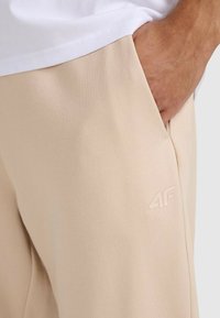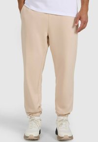 Osoba ubrana w beżowe spodnie dresowe z elastycznymi mankietami i białe trampki, stojąca na tle jasnoszarego tła.