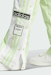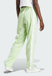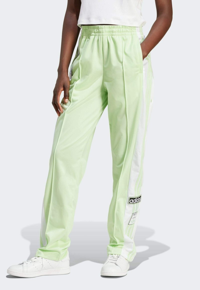 Jasnozielone spodnie dresowe z poliestru z białymi paskami po bokach i czarnym logo Adidas. Posiadają elastyczny pas i luźny krój dla wygody.