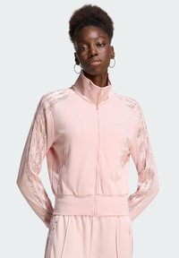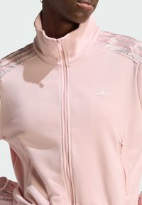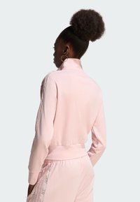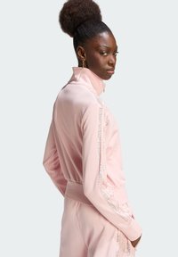 Kobieta ubrana w jasnoróżową sportową kurtkę na suwak i dopasowane spodnie z wzorzystymi paskami na rękawach i bokach spodni na jednolitym tle.