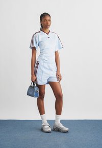 Osoba ubrana w jasnoniebieskie sportowe szorty, z rękami w kieszeniach, białe skarpetki i szare wsuwane sneakersy, stojąca na niebieskim dywanie.