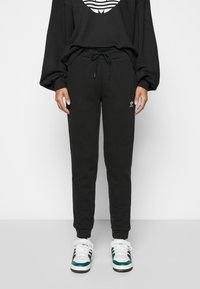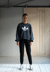 Czarny, oversize'owy sweter z białym logo, w zestawie z czarnymi dresami i wielokolorowymi sneakersami, umiejscowiony w jasnym pomieszczeniu z naturalnym światłem.