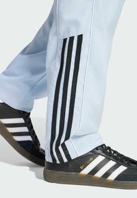 Jasnoniebieskie spodnie dresowe z czarnym logo Adidas, białymi paskami po bokach i luźnym krojem, zestawione z czarnymi trampkami z białymi paskami.
