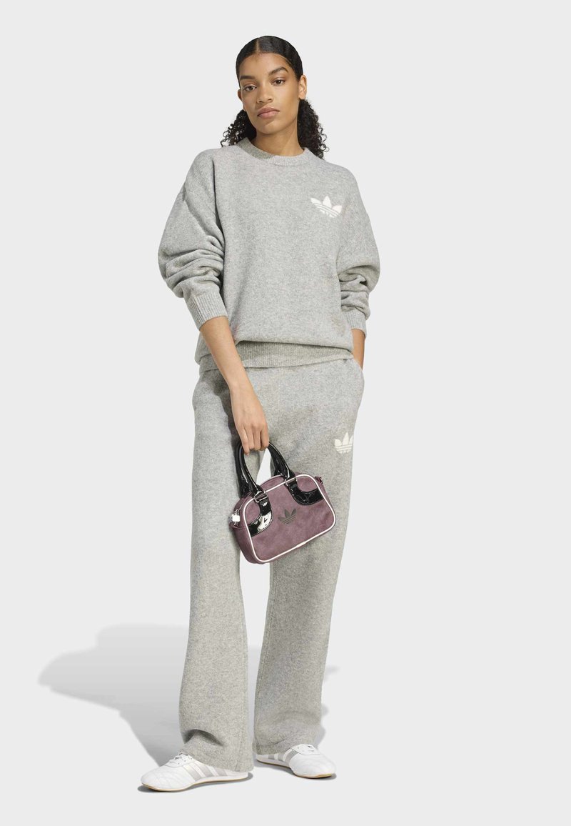Kobieta w szarej bluzie i spodniach Adidas, trzymająca małą fioletową torebkę z czarnymi uchwytami, ubrana w białe buty sportowe, stojąca na jednolitym tle.