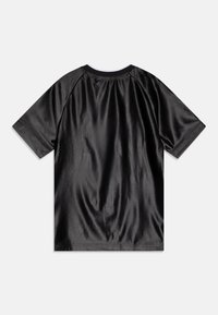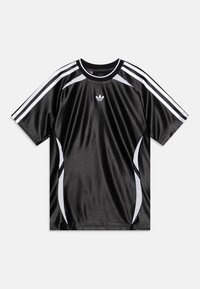 Czarna sportowa koszulka Adidas z krótkim rękawem, białe paski na ramionach i bokach oraz małe logo Adidas na środku klatki piersiowej.