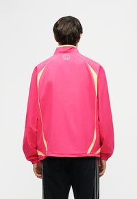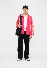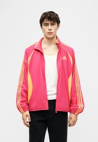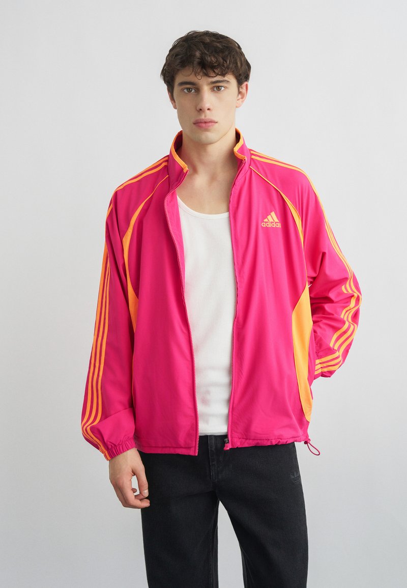 Młody mężczyzna w jasnoróżowej i pomarańczowej kurtce sportowej Adidas, na białym tank topie i czarnych spodniach, stojący na tle jednolitego szarego tła.