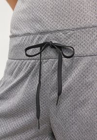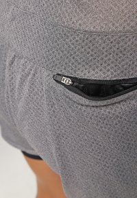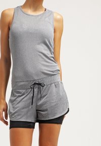 Kobieta w szarej, bezrękawnikowej sportowej bluzce i dopasowanych warstwowych szortach z czarnym troczkiem na jasnym tle.
