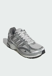 Srebrny but sportowy z siateczkową cholewką, teksturowanym wzorem, białą podeszwą i sznurowadłami. Wyposażony w technologię amortyzacji i smukły design.