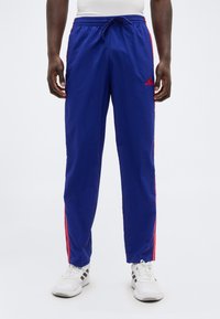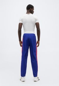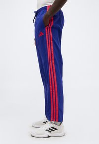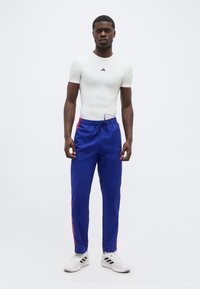 Mężczyzna ubrany w niebieskie spodnie treningowe Adidas z czerwonymi paskami i białe trampki, stojący na tle białego tła.