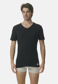 Czarny t-shirt z dekoltem w serek wykonany z bawełny, z krótkimi rękawami i subtelnym białym logo marki na dole po lewej stronie z przodu. Model nosi szare szorty.