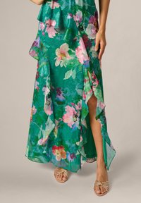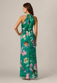 Kobieta w zielonej, kwiecistej sukience maxi bez rękawów, trzymająca beżową kopertówkę, stojąca na jednolitym tle.