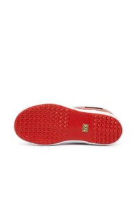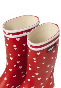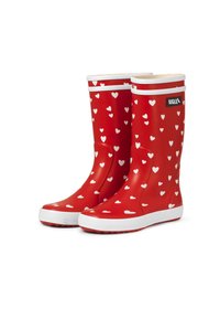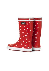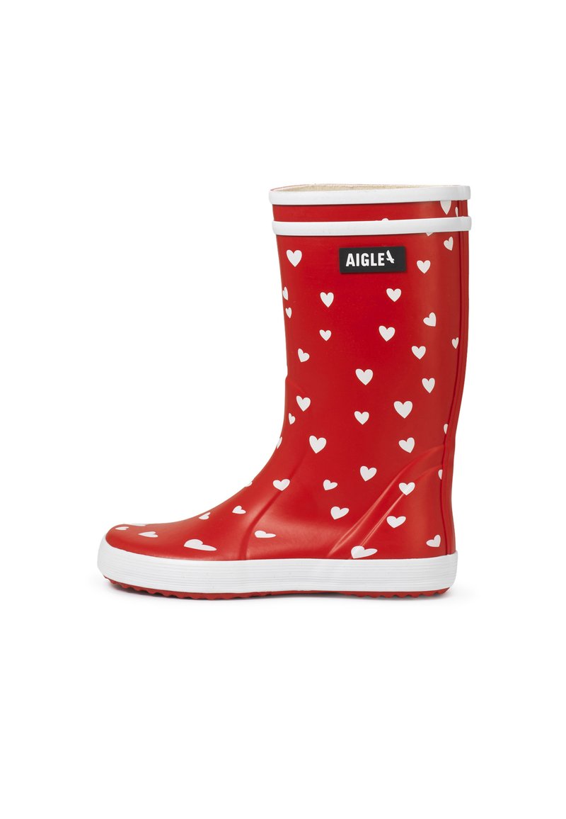Czerwony gumowy kalosz z białym wzorem serc, białą lamówką i podeszwą oraz czarnym prostokątnym logo „Aigle” przy górze.