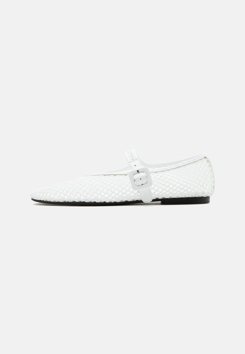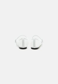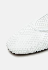 Biała płaska dłoń z siatkową cholewką i białym paskiem z kwadratową sprzączką, przedstawiona na jednolitym jasnoszarym tle.