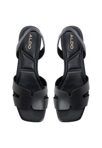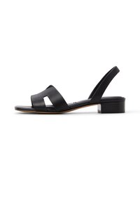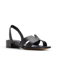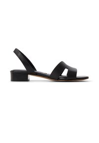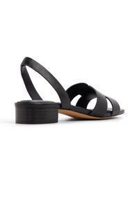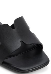 Czarne skórzane sandały z dwoma szerokimi paskami i odkrytymi palcami. Niski obcas typu block, minimalistyczny design i gładka faktura.