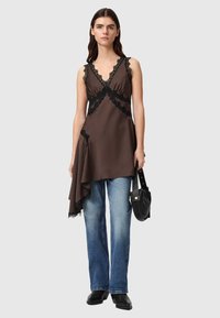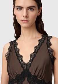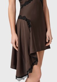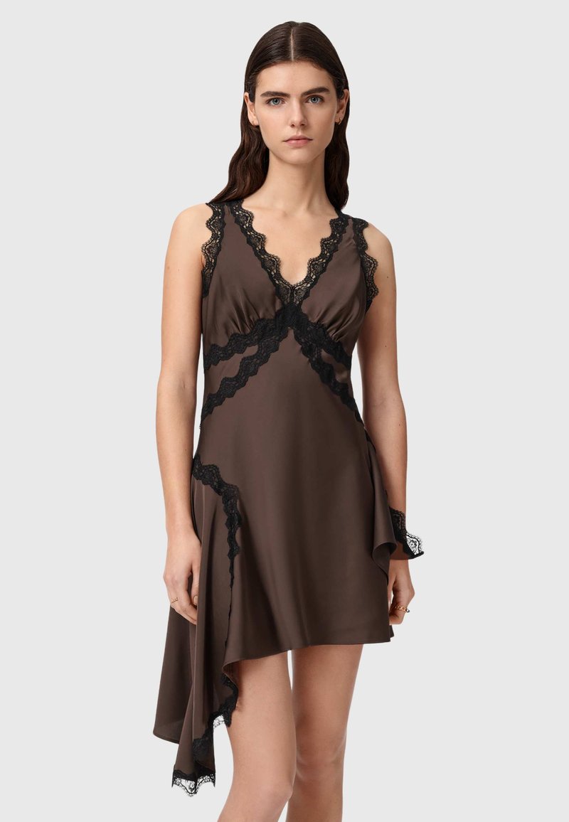 Młoda kobieta w brązowej sukience z satyny bez rękawów z czarną koronką i asymetrycznym dołem, stojąca na tle jednolitego szarego tła.