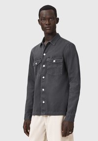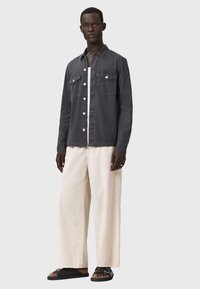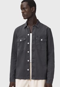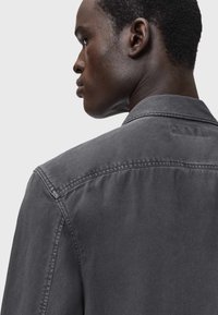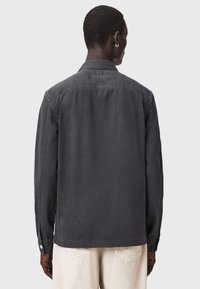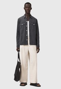 Mężczyzna ubrany w ciemnoszarą koszulę na guziki z kieszeniami na piersi oraz jasne spodnie, stoi na tle jednolitego jasnego tła.