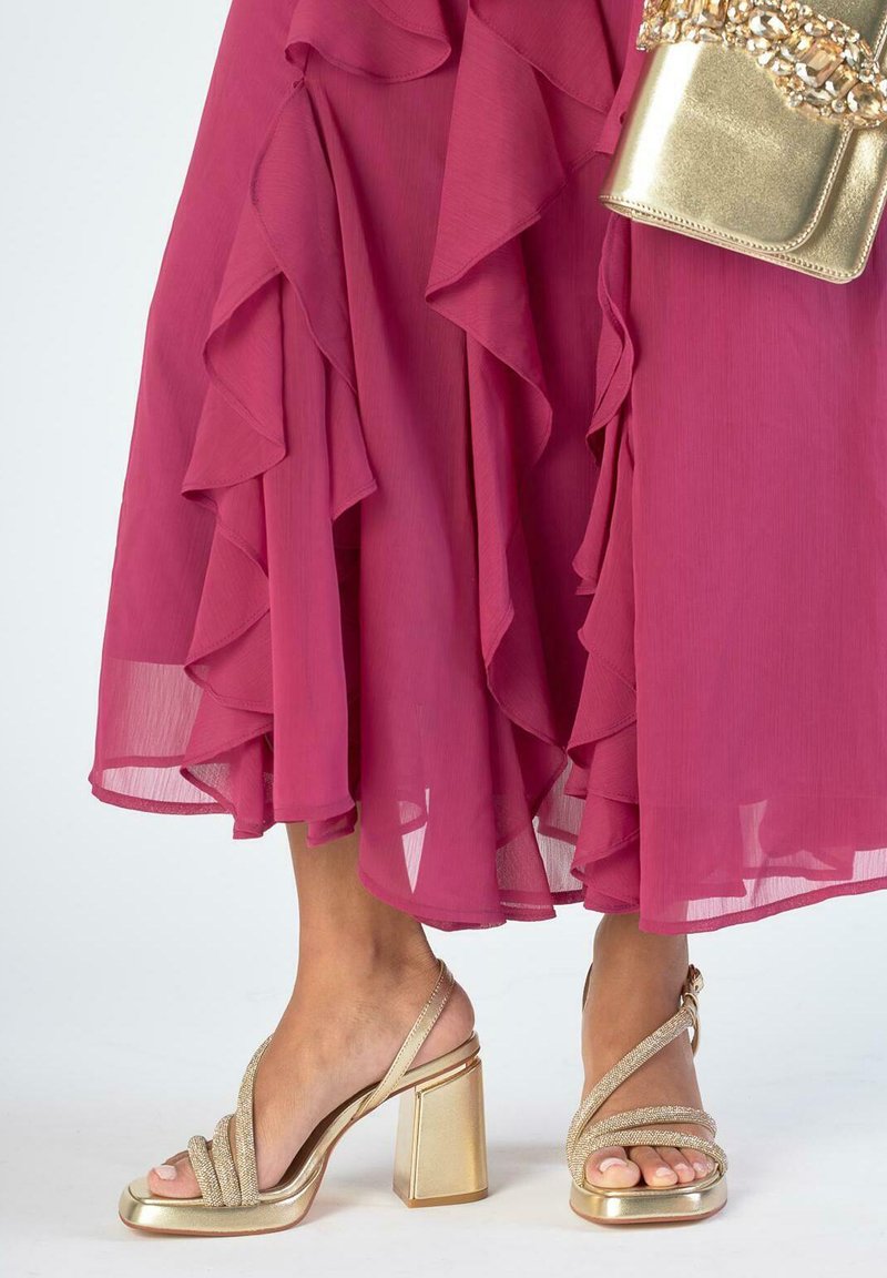 Marszczona krawędź sukienki w kolorze magenta, złote sandały na klocku i pasująca złota torebka z ozdobą z biżuterią.