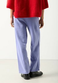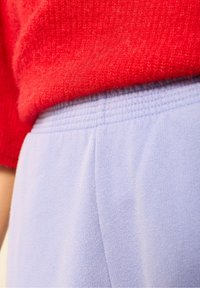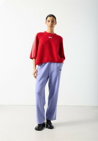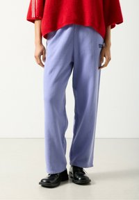 Jasnofioletowe spodnie z polaru o luźnym kroju, z bocznymi szwami i subtelnym logo. W zestawieniu z czarnymi butami dla kontrastu.
