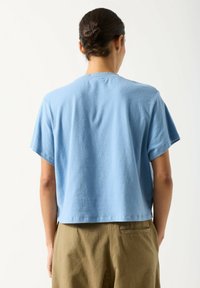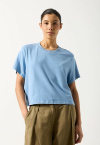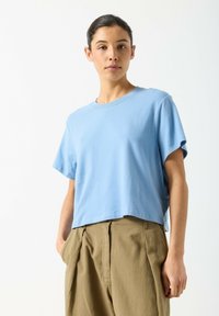Jasnoniebieska, krótka bawełniana koszulka z krótkim rękawem, okrągłym dekoltem i luźnym krojem, zestawiona z khaki plisowanymi spodniami. Gładka faktura tkaniny.