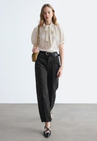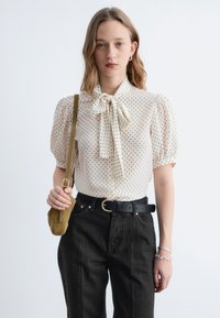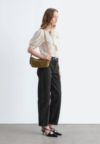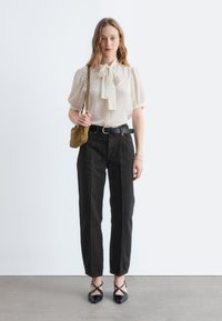 Młoda kobieta ubrana w białą bluzkę w czarne kropki z kokardą, czarne spodnie z wysokim stanem i trzymająca małą oliwkową torebkę na ramię.