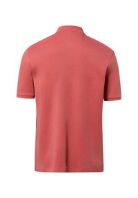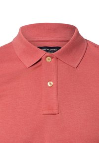 Męska koszulka polo z krótkim rękawem w kolorze wyblakłej czerwieni, z dwoma beżowymi guzikami i klasycznym kołnierzykiem, przedstawiona na białym tle.
