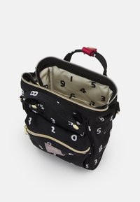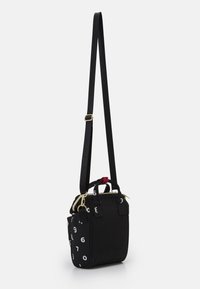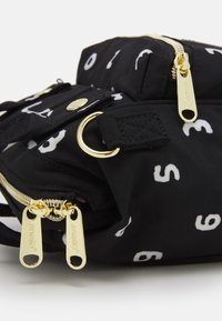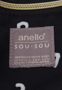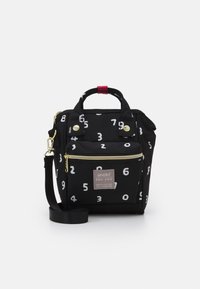 Czarna torebka z tkaniny z białymi wzorami w numery, przednia kieszonka na zamek, górne uchwyty z czerwoną taśmą oraz odpinany pasek na ramię.