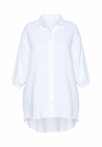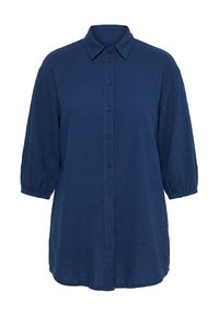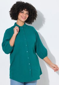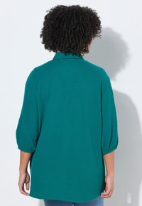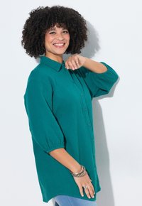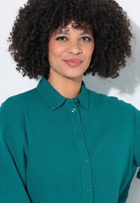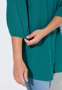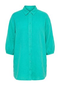 Kobieta uśmiechająca się, ubrana w luźną turkusową koszulę na guziki z bufkami na rękawach oraz jasnoniebieskie dżinsy, stojąca na białym tle.