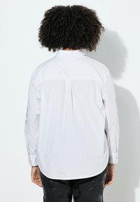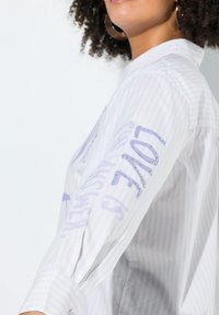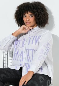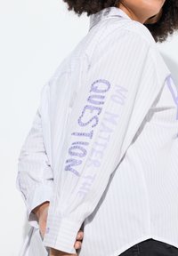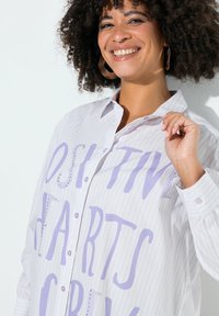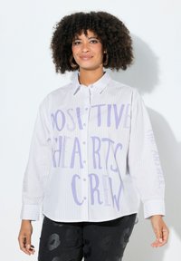 Koszula zapinana na guziki z lekkiego, prążkowanego materiału z fioletowym napisem „POSITIVE HEARTS CREW”. Długie rękawy, luźny krój, subtelne zdobienia.