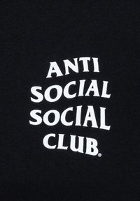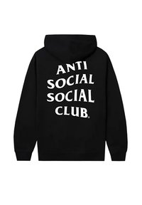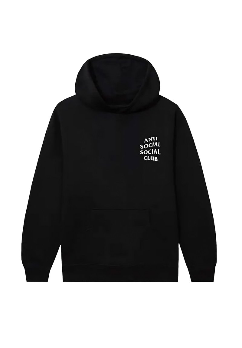 Czarna bluza z kapturem z dużą kieszenią kangurzą. Z przodu po lewej stronie znajduje się biały napis "ANTI SOCIAL SOCIAL CLUB." Prosty i stylowy design.