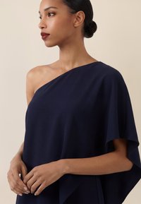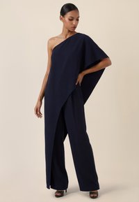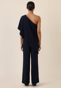 Kobieta ubrana w granatowy kombinezon na jedno ramię z szerokimi nogawkami i czarne sandały na obcasie z odkrytymi palcami, stojąca na tle jednolitego beżowego tła.