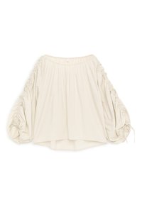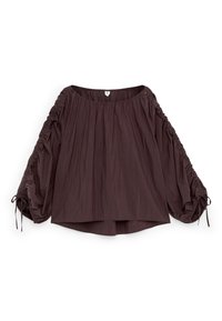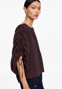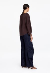 Kobieta o prostych ciemnych włosach, ubrana w luźną ciemnobrązową bluzkę z marszczonymi szerokimi rękawami oraz ciemnoniebieskie szerokie spodnie, dłonie w kieszeniach.