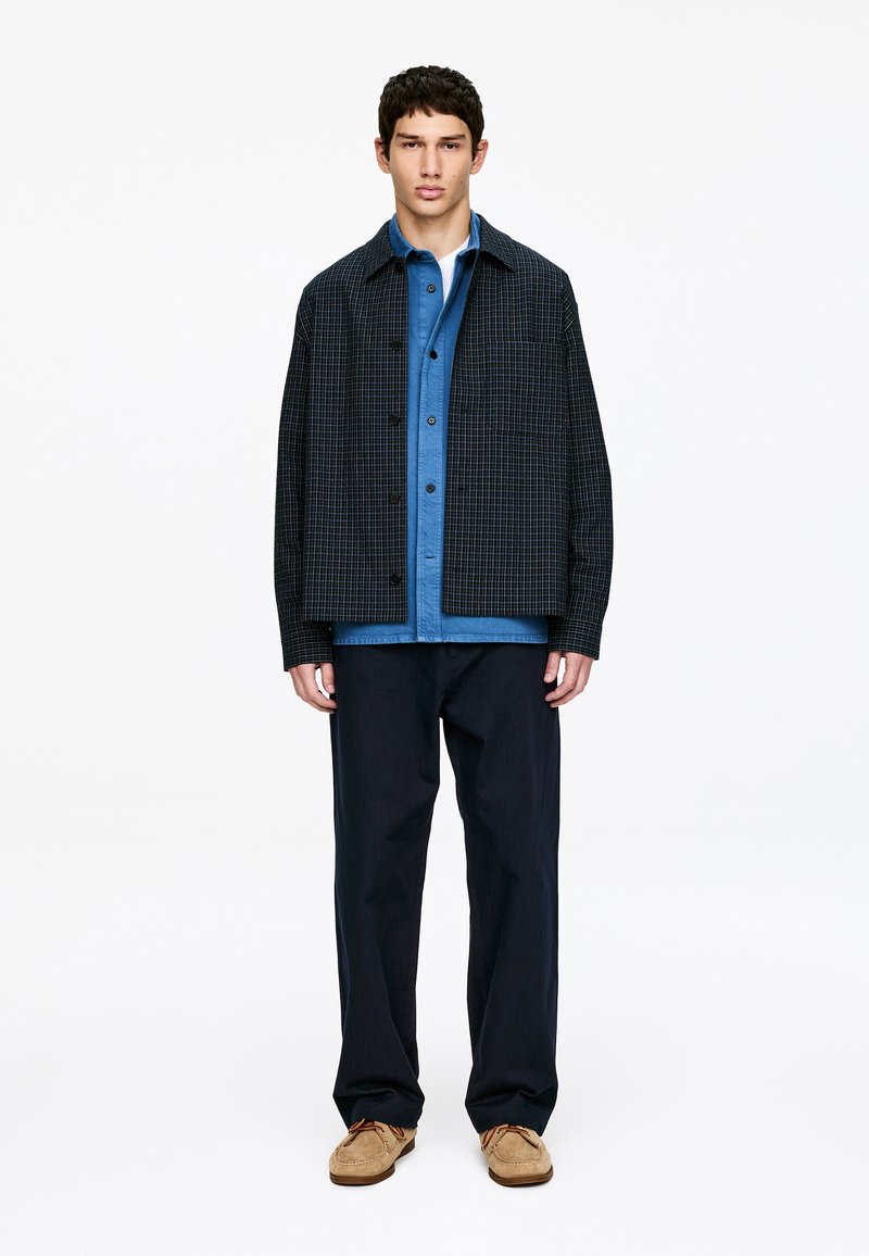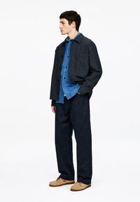Młody mężczyzna stojący, ubrany w czarną kraciastą kurtkę na niebieską koszulę na guziki, ciemne spodnie i jasnobrązowe zamszowe buty na białym tle.