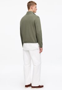 Blondyn w oliwkowym swetrze na pół zamek, nałożonym na białą koszulę na guziki i białe spodnie, stojący na tle białego tła.
