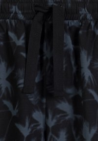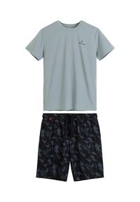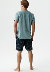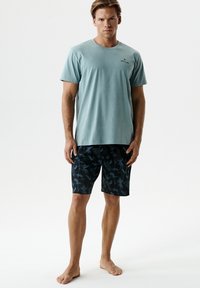 Młody mężczyzna stojący boso, ubrany w jasnoturkusową koszulkę i czarne szorty z niebieskimi kwiatowymi wzorami na białym tle.