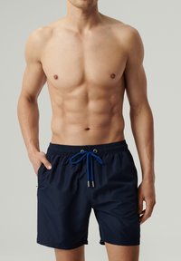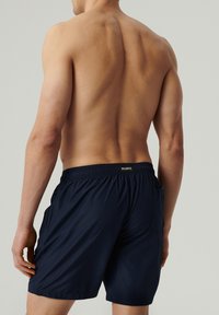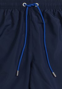 Granatowe szorty kąpielowe z elastycznym paskiem w talii, regulowanym niebieskim sznurkiem i bocznymi kieszeniami. Gładki, lekki materiał.
