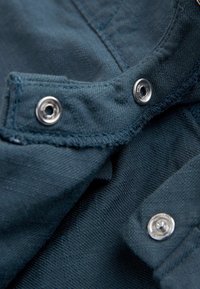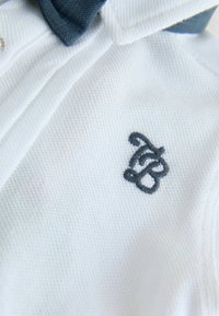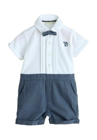 Biały kombinezon z krótkim rękawem, kołnierzykiem, granatowym dołem, ozdobną kokardą, guzikami z przodu i dwoma bocznymi kieszeniami. Z haftowanym logo.