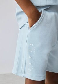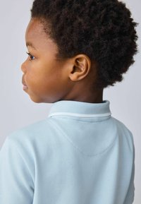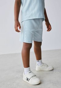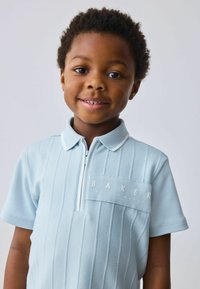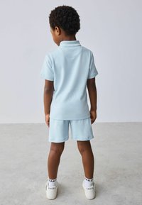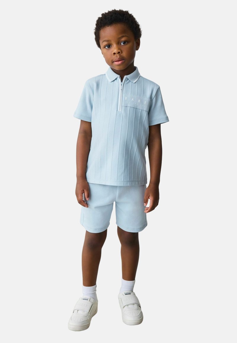 Jasnoniebieska koszulka polo z zamkiem błyskawicznym przy dekolcie, fakturą prążkowaną i kieszenią na piersi. Dopasowane szorty w tym samym kolorze. Białe tenisówki i skarpetki.
