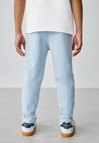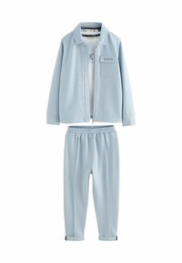 Jasnoniebieski bawełniany dres, składający się z kurtki na zamek z kieszenią oraz spodni z mankietami i elastycznym pasem. Gładka faktura i prosty design.
