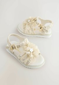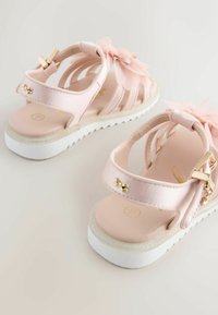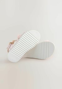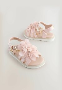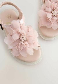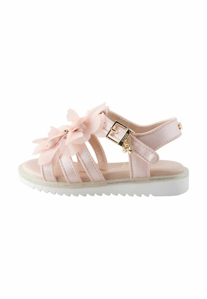 Różowe sandały z kwiatowymi ozdobami, wieloma paskami, zapięciem na klamrę oraz przezroczystą podeszwą z błyszczącą krawędzią.
