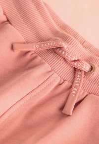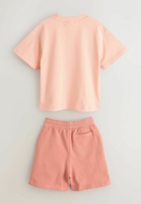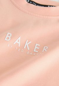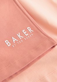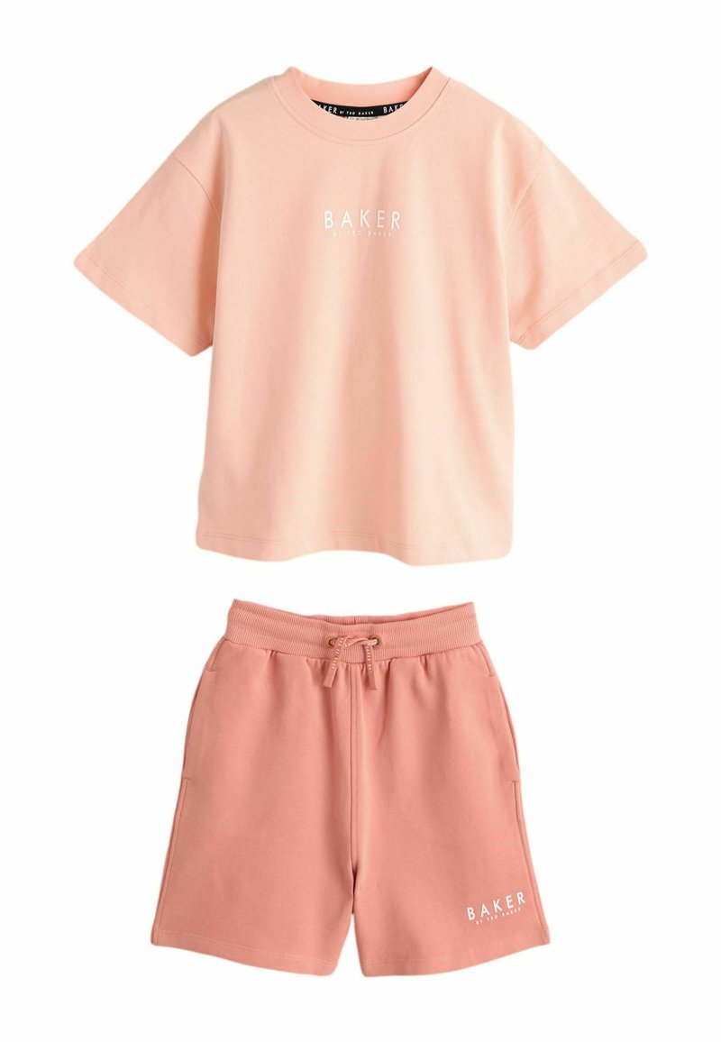 Dwuczęściowy różowy zestaw casualowy z krótkim rękawem i szortami z troczkiem, oba elementy ozdobione białymi logo "Baker by Ted Baker".