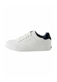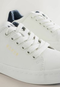 Biały sneaker z teksturowaną syntetyczną cholewką, okrągłym noskiem, sznurowanym fasonem i kontrastującym granatowym obcasem. Złote logo po boku.