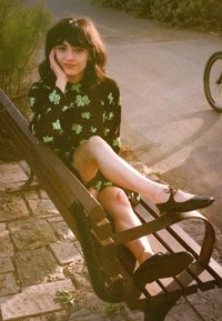 Młoda kobieta o ciemnych włosach w zielonej sukience w kwiaty, siedząca ze skrzyżowanymi nogami na drewnianej ławce na zewnątrz, opierająca głowę na dłoni.