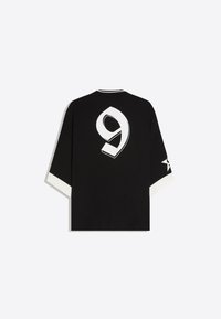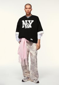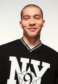 Młody mężczyzna o krótkich włosach, ubrany w czarną, oversize'ową koszulę z białym nadrukiem "NY" i gwiazdą, w połączeniu z jasnoszarymi, wzorzystymi spodniami.