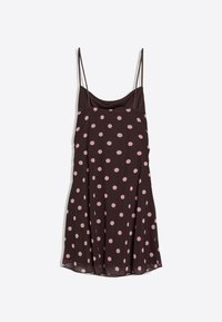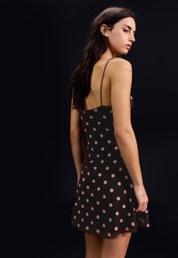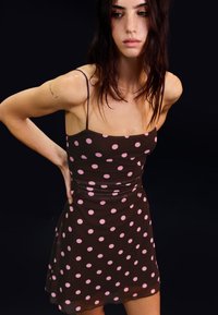 Kobieta o ciemnych włosach, ubrana w brązową sukienkę bez rękawów w różowe kropki, stojąca na czarnym tle, patrząca w dół.