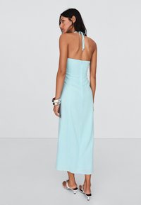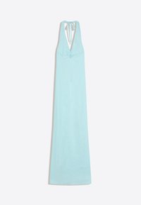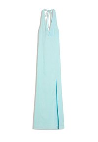 Kobieta w jasnoniebieską bezrękawnikową sukienkę typu halter z przednim rozcięciem i białe sandały na otwartym nosku, pozująca na jednolitym tle.