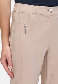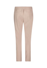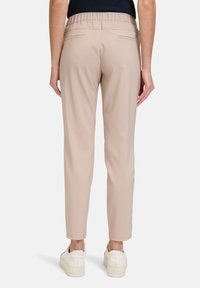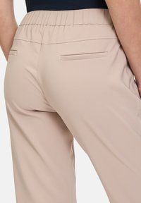 Beżowe tapered spodnie z elastycznym paskiem, dwiema tylnymi kieszeniami i miękkim, gładkim materiałem. Noszone z białymi trampkami.