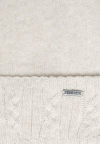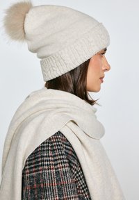 Jasnobeżowa dzianinowa czapka z warkoczowym wzorem i pomponem. Miękki, dopasowany beżowy szalik luźno owinięty wokół szyi. Struktura wydaje się przytulna.