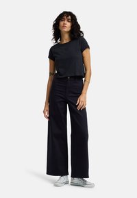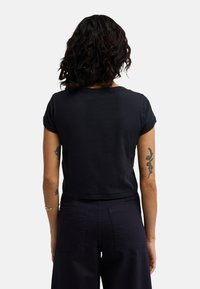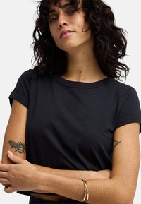 Czarny krótki t-shirt wykonany z bawełny, z krótkimi podwiniętymi rękawami i okrągłym dekoltem. Posiada subtelne logo na piersi.