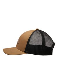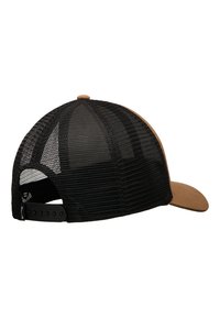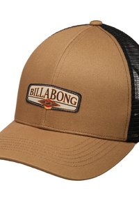 Brązowa czapka z zaokrąglonym przodem, czarną siateczką z tyłu i naszywką z logo Billabong w kolorze pomarańczowo-białym na przednim panelu.