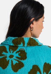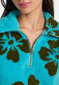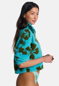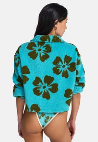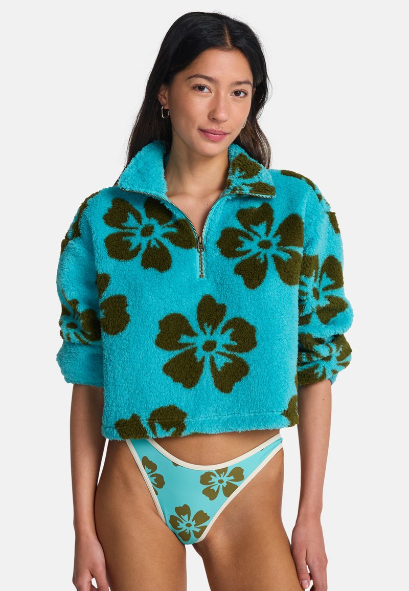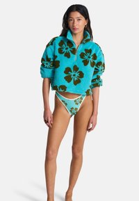 Kobieta ubrana w turkusowy polar z dużymi brązowymi kwiatowymi wzorami oraz dopasowane, wysokie majtki bikini.